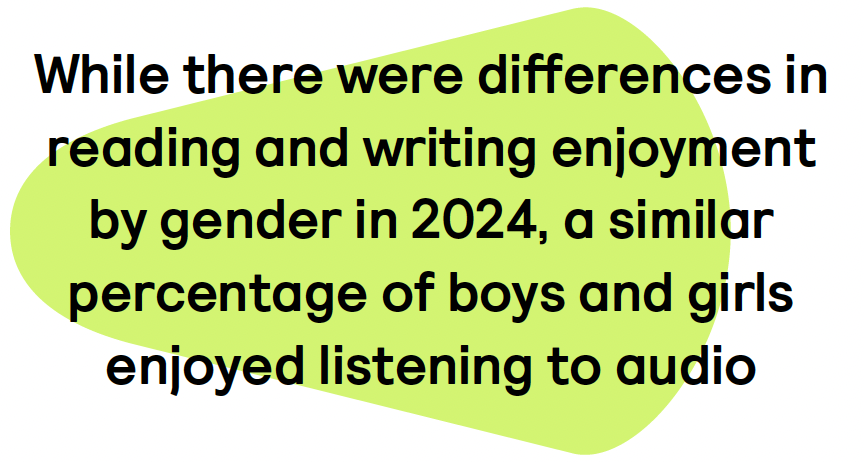 Interestingly, the findings show that some groups who are disproportionately impacted by the reading for pleasure crisis, such as boys, particularly stand to benefit. Indeed, the substantial gender gap in boys’ and girls’ reading enjoyment (28.2% vs 40.5%) reverses direction when it comes to audio, with slightly more boys than girls saying they enjoy listening to audio (43.4% vs 40.4%). This is markedly different to the much more significant gender gap in reading and writing enjoyment.